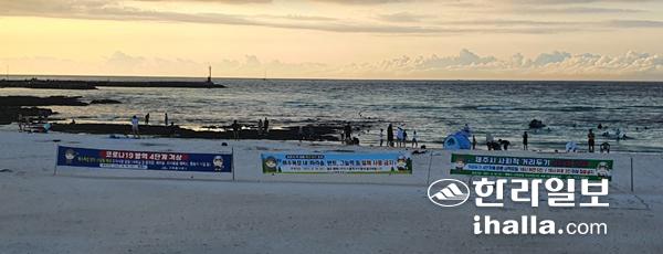 28일 오후 제주시 구좌읍 김녕해수욕장에 해수욕장 폐장과 집합금지 조치를 알리는 현수막이 보이고 있다.