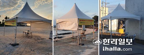 텅 비어 있는 천막. 폐장 전 이곳에서 발열체크와 안심스티커 배부가 이뤄졌다. 왼쪽부터 협재, 금능, 월정해수욕장.