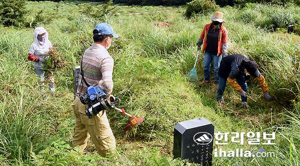 28일 제주시공설공동묘지를 찾은 벌초객들이 조상의 산소 주변에 자라난 풀을 베고 있다. 이상국기자