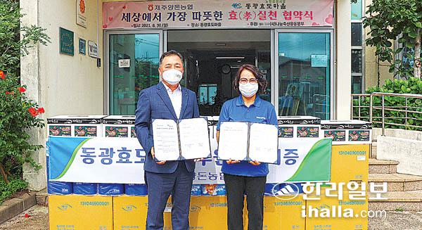 제주양돈농협(조합장 고권진)은 30일 서귀포시 안덕면 동광리 소재 노인요양시설인 동광효도마을을 방문해 '효' 실천 업무협약을 체결하고, 돼지고기와 생필품을 전달했다. 고권진 조합장은 "이번 효 실천 협약을 통해 매월 정기적으로 돈육 지원 등 소외계층과 어려운 이웃을 위한 공헌활동을 실천해 나가겠다"고 밝혔다.