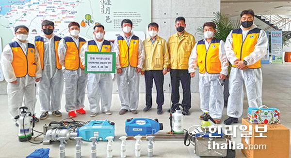 제주시 애월읍과 한울라이온스클럽(회장 진동일)은 지난 28일 읍직원 및 회원 10명이 참여한 가운데 애월읍사무소와 곽지해수욕장 쉼터 등 다중이 이용하는 시설에 대해 코로나19 확산 방지를 위해 방역 봉사활동을 전개했다.