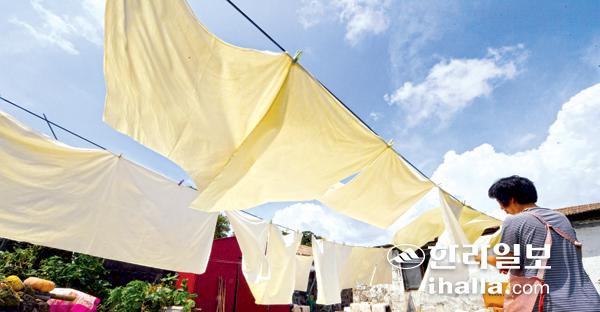 따가운 햇살이 내리쬔 30일 서귀포시 표선면 성읍민속마을에서 마을 어르신이 늦여름 파란하늘 아래서 곱게 물들어 가는 갈천 말리기 작업을 하고 있다. 강희만기자