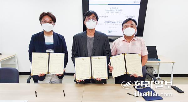 제주대학교 4단계 BK(두뇌한국)21 '빅데이터 기반 해양융합 전문인력양성사업단'(단장 배진호)은 지난 26일 제주대에서 (주)인포마인드(대표 강희석), (주)아라커뮤니케이션즈(대표 박경배)와 해양빅데이터를 위한 교육·연구 공유 플랫폼 개발과 구축을 위한 업무협약을 체결했다.