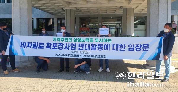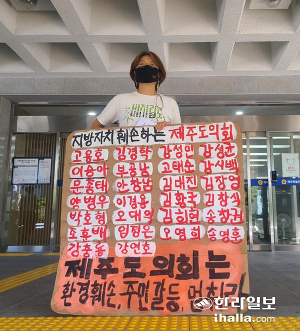 임시회에 앞서 성산읍·구좌읍 이장단협의회는 이날 오전 9시30분쯤 제주도의회 정문에서 기자회견을 열고 "삶의 버팀목으로 살아온 우리들의 환경을 무시하고, 오로지 개발로 개인의 이익만을 추구하는 집단으로 매도하는 편협한 환경운동 활동을 지금 당장 멈춰야 한다"고 주장했다.