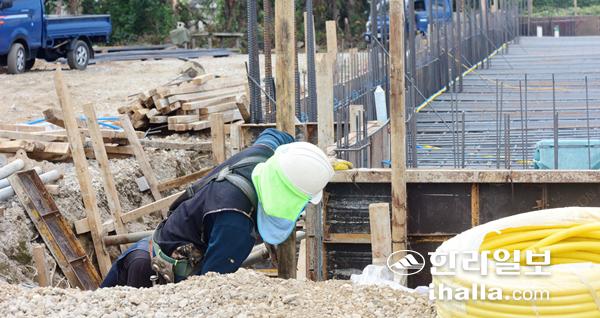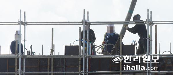 31일 오후 제주시 영평동의 한 공사현장에서 근로자들이 작업에 열중하고 있다. 이상국기자