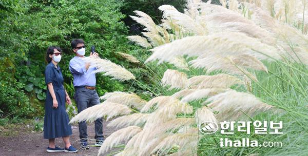 1일 서귀포시 휴애리자연생활공원을 찾은 관광객들이 화려하게 피어난 팜파스그라스를 카메라에 담고 있다. 팜파스그라스는 벼과의 여러해살이 초본식물이다. 원산지는 브라질, 아르헨티나, 우루과이, 칠레 등 남아메리카의 팜파스 지역이다. 이상국기자