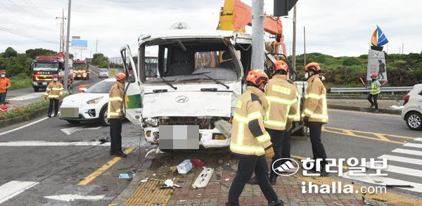 2일 제주동부소방서에 따르면 제주시 구좌읍 김녕입구사거리에서 크레인차량과 택시가 충돌하는 사고가 발생했다. 이 사고로 인해 택시운전자 등 3명이 다쳐 병원으로 이송됐다, 사진은 사고 후 크레인차량의 모습. 사진=이상국기자