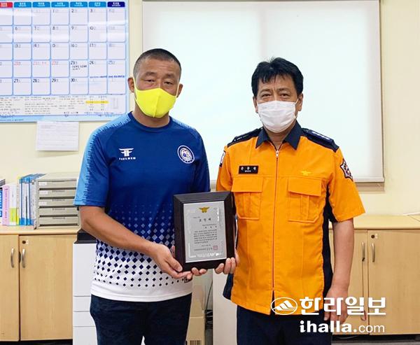 제주서부소방서(서장 문동원)는 2일 화재 현장에서 신속한 초기 대응으로 큰 불을 막을 수 있도록 기여한 민간인에게 소방활동 유공표창을 수여했다.