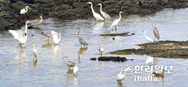 월동지로 이동중이던 백로들이 1일 잠시 휴식을 위해 제주시 구좌읍 동복리 해안을 찾아 먹이활동을 하고 있다. 강희만기자