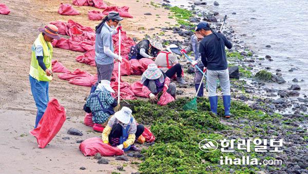 파래 수거 ‘구슬땀’2일 제주시 이호테우해수욕장에서 바다환경지킴이들이 끝없이 밀려오는 파래를 수거하고 있다. 강희만기자