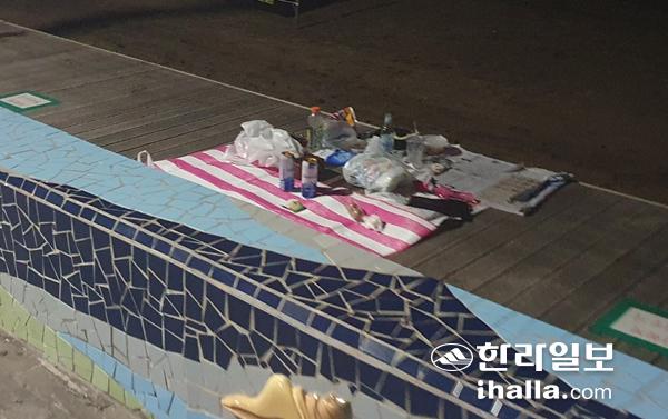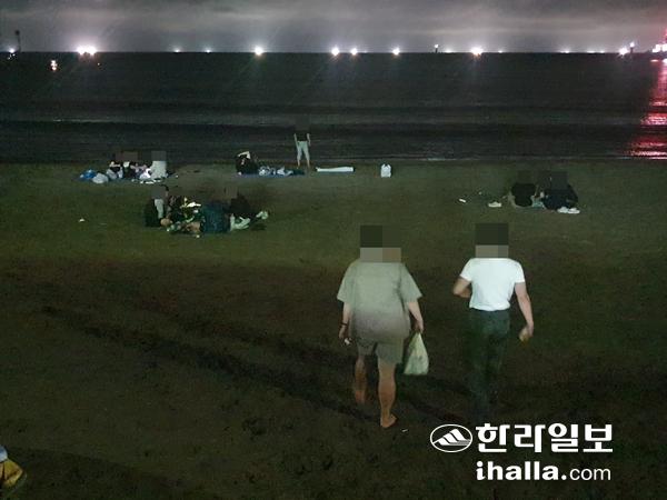 3일 이호해수욕장 백사장에서 노상술판을 벌이는 노상객들. 편의점에서 음식을 사들고 백사장으로 걸어가고 있는 노상객도 보이고 있다.