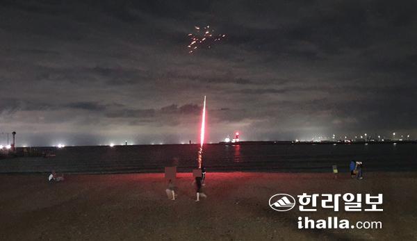 3일 이호해수욕장 내 백사장에서 노상객들이 불꽃놀이를 즐기고 있다.