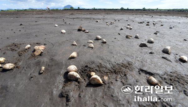 지난 1일부터 3일까지 제주 서부지역에 많은 비가 내리면서 파종을 마친 마늘과 양배추, 브로콜리 등의 막심한 피해가 속출하고 있다. 사진은 서귀포시 대정읍 하모리 한 농경지에서 파종을 마친 마늘 씨앗이 빗물에 쓸려 바닥에 드러나 있는 모습. 강희만기자