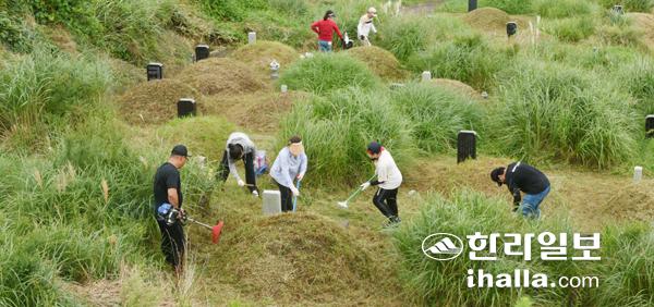 추석을 앞둔 5일 제주시공설묘지를 찾은 많은 시민들이 벌초를 하고 있다. 이상국기자