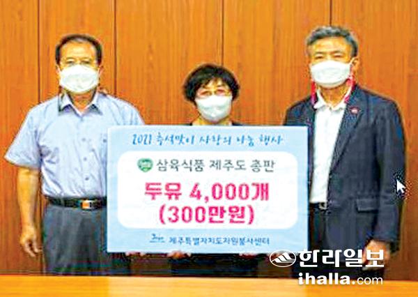 제주특별자치도자원봉사센터(센터장 고태언)는 추석을 맞아 삼육식품 제주도 총판(대표 김추자)에서 후원한 두유 4000개(300만원 상당)를 도내 아동 및 노인 복지기관에 전달했다.