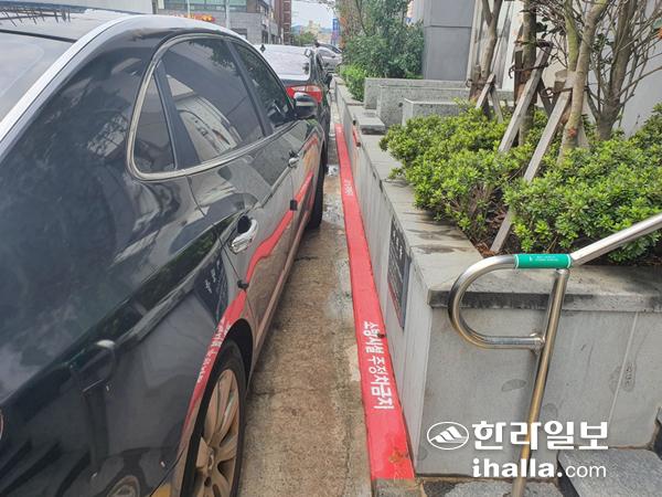 7일 오전 제주시 이도2동의 한 건물 소방시설 앞에 차량들이 불법주차돼 있다. 강민성 기자