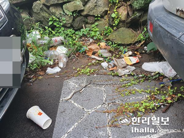 제주시 이도2동의 한 골목길에는 주차된 차량 사이로 쓰레기들이 나뒹굴고 있었다.