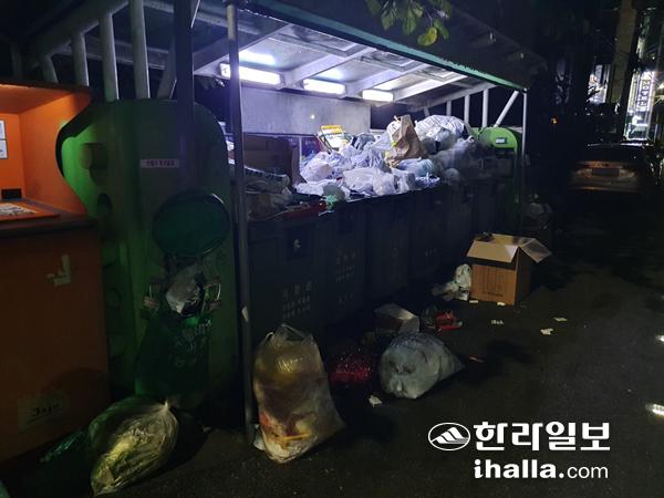 지난 7일 제주시 연동의 한 클린하우스에 쓰레기가 가득차 도로변에 쓰레기들이 놓여져 있다.
