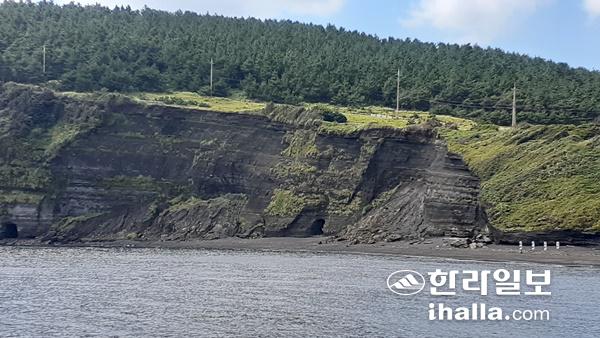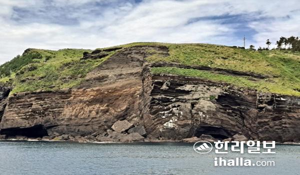 마라도 여객선에서 바라본 송악산의 모습. 아름다운 절경이지만 해안절벽 곳곳에서 붕괴현상이 잇따르며 체계적인 중장기 보전방안 마련 및 안전문제에 대한 고민이 필요하다. 강희만 기자