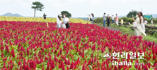 8일 서귀포시 표선면 보롬왓을 찾은 관광객들이 맨드라미를 배경으로 기념사진을 찍고있다. 이상국기자