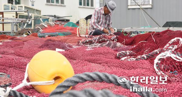 제주시 조천읍에서 한 어민이 그물을 제작하느라 분주한 시간을 보내고 있다. 이상국기자