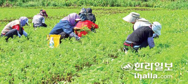 9일 서귀포시 성산읍 수산리 한 밭에서 농민들이 당근솎기 작업으로 분주한 시간을 보내고 있다. 이상국기자