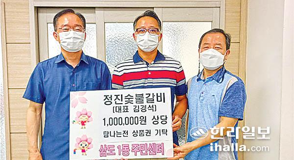 제주시 삼도1동 정진숯불갈비(대표 김경석)는 추석을 맞이해 어려운 이웃들을 돕는 데 사용해 달라며 지난 7일 삼도1동 주민센터에 탐나는전 상품권(100만원 상당)을 기탁했다.