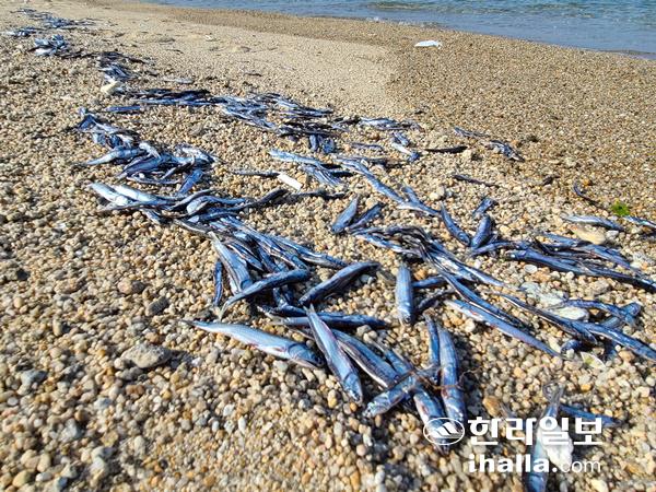 11일 강원 고성군의 한 해변 백장에 파도에 밀려 나온 멸치들이 널려 있다. 이들 멸치는 이날 오전에 백사장으로 밀려 나와 주민과 관광객들이 주워가기도 했다. 동해안에서는 멸치 떼가 백사장으로 밀려 나오는 일이 가끔 발생하고 있다. 주민들은 멸치가 큰 고기에게 쫓기다가 파도에 밀려 해변으로 나오는 것으로 보고 있다.