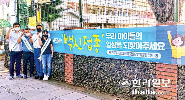 서귀포시교육지원청은 2021학년도 서귀포시학교운영위원장협의회(회장 안성진)에서 관내 유·초·중·고·특수학교 74개교를 대상으로 '코로나19 백신 조기 접종 독려를 위한 홍보 현수막'배부 행사를 전개한다고 12일 밝혔다.