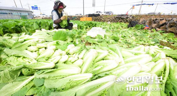 12일 제주시 애월읍 한 밭에서 얼갈이배추 수확 작업이 한창이다. 이상국기자