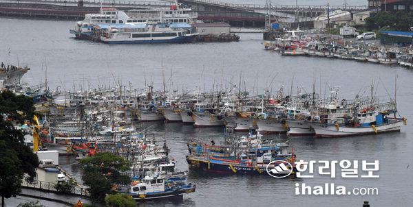 제14호 태풍 찬투가 북상하며 13일 제주도 남쪽 먼바다에 태풍주의보가 내려진 가운데 서귀포항에 많은 어선들이 피항해 있다. 강희만기자