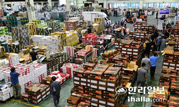 어느새 추석이 코 앞이다. 13일 제주시 일도2동 제주시농협 농산물공판장에서 추석 대목을 맞아 과일 경매가 이뤄지고 있다. 강희만기자
