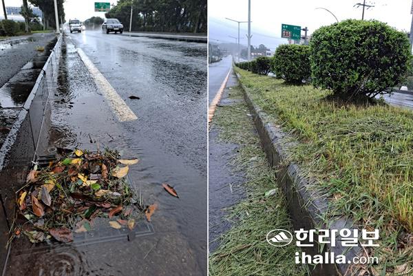 태풍 '찬투'의 북상으로 많은 비가 내리고 있는 가운데 서귀포지역 도로변 일부 집수구가 낙엽과 생활쓰레기로 막혀 있지만 행정 에서의 현장 대응은 미비하다. 특히 일부 구간에서는 예초작업을 하고 이를 방치하면서 교통사고 발생 우려도 낳고 있다.