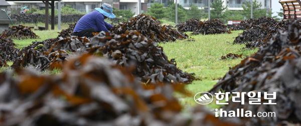 15일 서귀포시 성산읍 해안가에서 어민들이 태풍이 오기 전에 수확한 감태를 손질하느라 분주한 시간을 보내고 있다. 이상국기자
