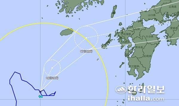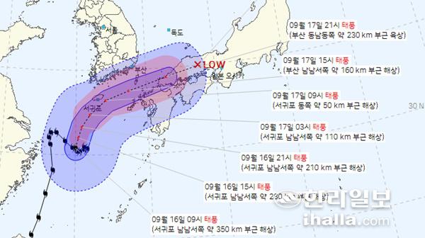 이어 17일 오전 9시 제주에 가장 근접한 서귀포 동쪽 약 50km 부근 해상을 통과하고 이후 쓰시마섬 이남을 거쳐 18일 오전에 온대저기압으로 약화될 것으로 전망됐다.