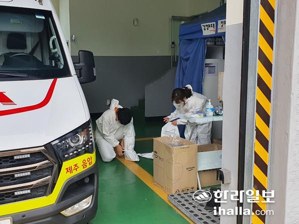 제주보건소에 마련된 선별진료소. 간호공무원들이 검사자의 검체를 체취하고 있다.