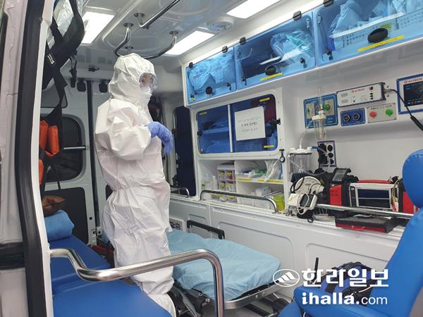 제주소방서 항만119센터 소속 고은희(34·여) 소방교와 양혁진(31) 소방사는 2년째 코로나19 전담 구급대원으로 활동하고 있다. 이들은 확진자가 발생하면 생활치료센터나 병원으로 옮기는 역할을 맡는다.