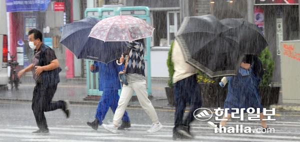 태풍 '찬투'가 다가오면서 16일 오후부터 제주지역에 많은 비가 내리자 시민들이 바쁘게 발걸음을 움직이고 있다. 강희만 기자
