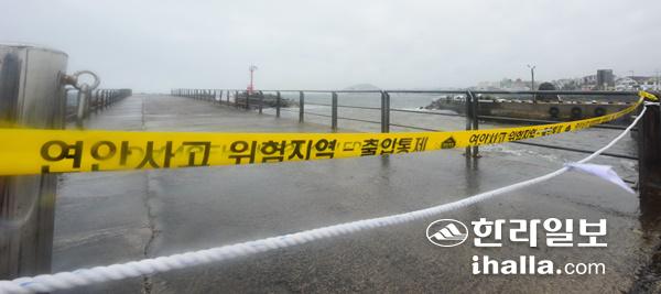 태풍 '찬투'가 북상하자 높은 파도가 치고 있는 제주시 용담포구에 통제선이 설치됐다. 이상국 기자