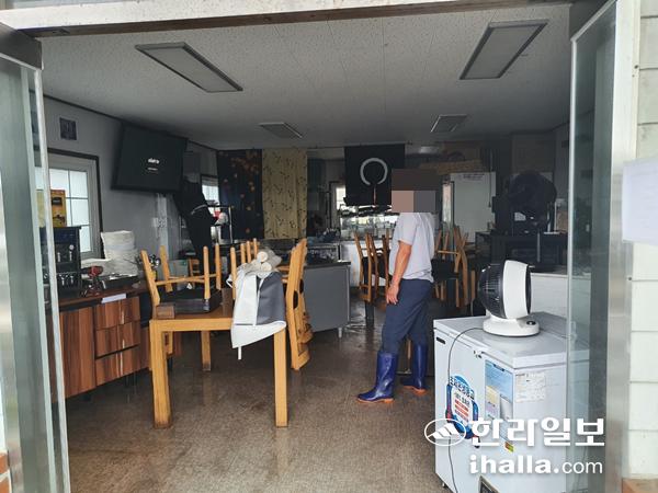 또 침수 피해를 크게 입은 용담2동 소재 A식당 주인도 어두운 표정을 지은 채 청소를 하고 있었다.