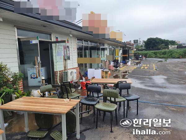 17일 제주시 용담2동 소재 식당과 렌터카. 태풍 당시 물에 잠겼지만 지금은 모두 빠진 상태다. 내부에선 직원들이 청소작업을 하고 있다. 사진=강민성기자