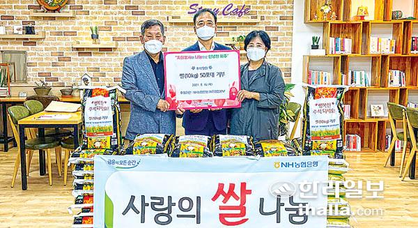 NH농협은행 제주본부(본부장 문상철)는 추석맞이 온정 더하기 나눔행사의 일환으로 지난 16일 제주시자원봉사센터(센터장 이승희)를 방문해 사랑의 쌀(10㎏) 50포대 나눔행사를 진행했다.