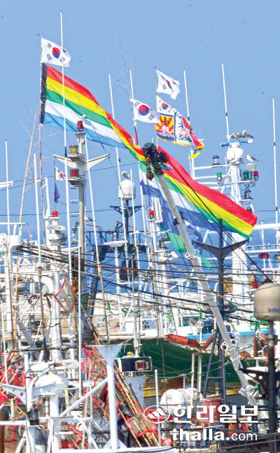 추석 연휴 마지막 날인 22일 제주시 한림읍 한림항에는 정박 중인 어선마다 선원들의 무사안녕과 풍어를 기원하는 만선기가 펄럭이고 있다. 강희만기자