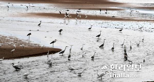 23일 제주시 구좌읍 종달리 해안가에 월동지로 이동 중이던 왜가리와 백로들이 찾아 먹이 활동을 하고 있다. 강희만기자