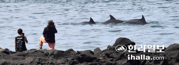 23일 서귀포시 대정읍 해안 갯바위에서 관광객들이 남방큰돌고래가 유영하는 모습을 보고 있다. 강희만기자