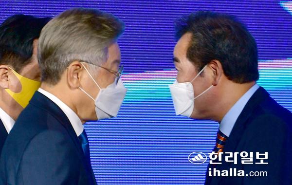 더불어민주당 대통령선거 후보자 선출을 위한 광주·전남 합동연설회가 열린 25일 오후 광주 서구 김대중컨벤션센터에서 득표 결과 발표 직후 이재명(왼쪽) 후보와 이낙연 후보가 엇갈려 지나고 있다. 연합뉴스