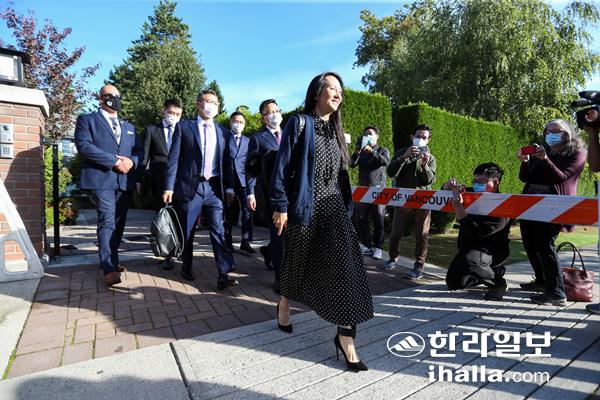 미국의 대이란 제재 위반 혐의로 캐나다에서 체포돼 가택연금 중인 중국 통신장비업체 화웨이의 멍완저우 부회장 겸 최고재무책임자(CFO)가 24일(현지시간) 공판에 참석하기 위해 전자발찌를 찬 채 밴쿠버 자택을 나서고 있다. 멍 부회장이 미국 법무부와 기소 연기에 합의함에 따라 이날 브리티시 컬럼비아(BC)주 대법원은 멍 부회장의 범죄인 인도 재판을 기각하고 석방 명령을 내렸다.