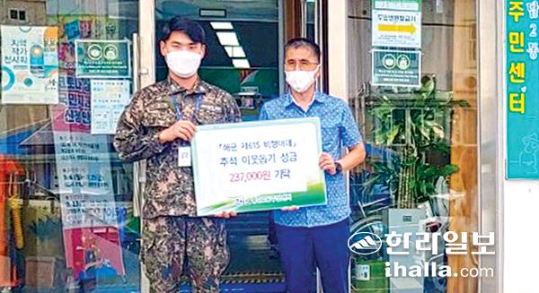 해군 제615비행대대(대대장 안승민)는 지난 23일 추석 명절 기간 제주시 용담2동 관내 어려운 이웃들에게 전달해 달라며 23만7000원의 이웃돕기 성금을 용담2동주민센터에 기탁했다.
