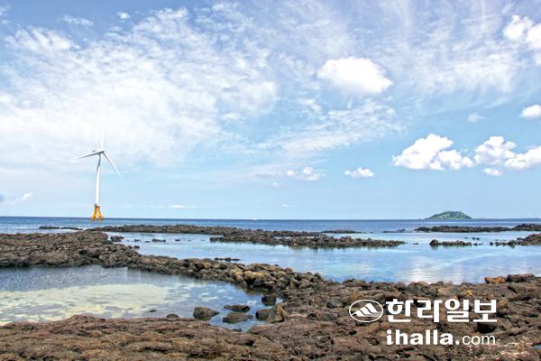 금등리 해변에서 바라본 풍력발전기와 비양도