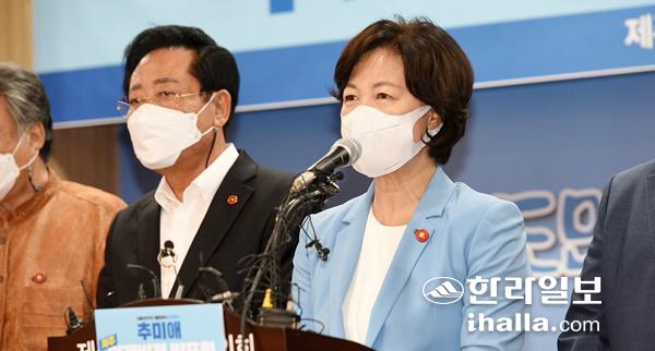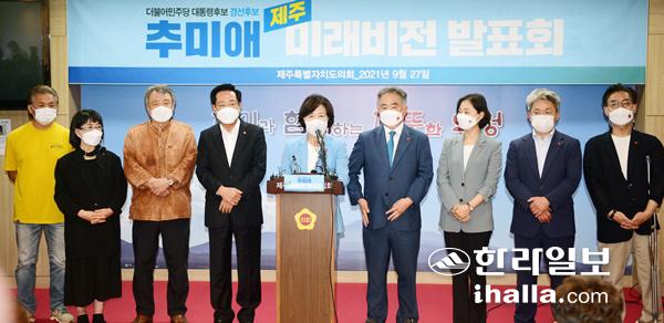 더불어민주당 대권주자인 추미애 전 법무부장관이 27일 오후 제주도의회에서 '제주미래비전'을 발표하고 있다. 이상국기자